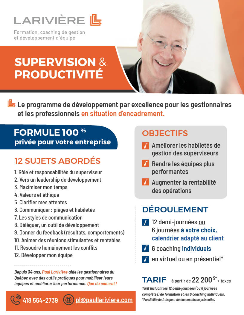 « Supervision et Productivité » constitue le programme de développement par excellence pour vos gestionnaires. Il se déploie sous douze thématiques distinctes qui recoupent la réalité de tout gestionnaire d’équipe sur le terrain. Pas de grande théorie, que du concret!